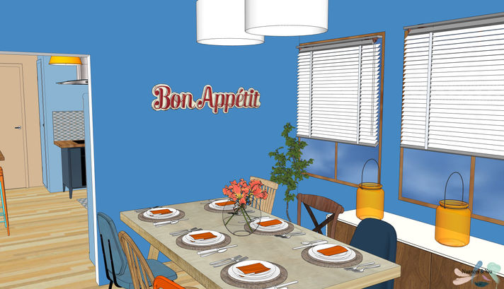 Le fil conducteur demandé est le bleu avec des touches toniques oranges.